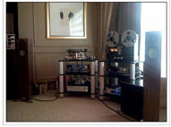 First one of our duping ATRs, Larry, in the TAD room. The fader on top of the I/Os is being used as a level control, and the output is being fed into the switchbox full of XLR cables to the left of the ATR. The fader fed the Ayre amps directly through that switcher. Most of the cabling was PranaWire. The other source switched through the box was a very high quality music server. Thanks to Paul Birkeland for pulling together the switcher at zero hour before I hit the road to Vegas!